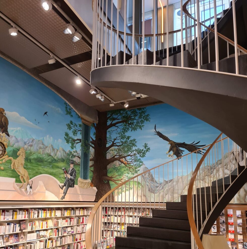 Création de fresques monumentales, comme ici à Genève, chez Payot – Nature & découvertes